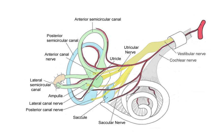 - Superior vestibular nerve: superior canal, lateral canal, utricle