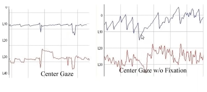 Spontaneous horizontal nystagmus to the right with a very low intensity during fixation. However, when blocking visual fixation with Frenzel lenses (Video 2), the intensity of the nystagmus increased significantly.
