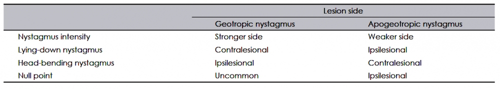 When determination of the involved side using the Ewald’s second law is difficult due to fairly symmetrical responses during the supine roll test, the direction of lying-down nystagmus (LDN) or head-bending nystagmus (HBN) may help. In geotropic horizontal canal-BPPV, LDN beats mostly toward the intact side, while HBN is directed to the affected side. By contrast, LDN is usually ipsilesional and HBN is mostly contralesional in the apogeotropic form. Patients with apogeotropic horizontal canal-BPPV may have a null head position in which the induced horizontal nystagmus disappears or becomes minimal. The null position is usually found when the head is turned to the affected side by 10-20°.