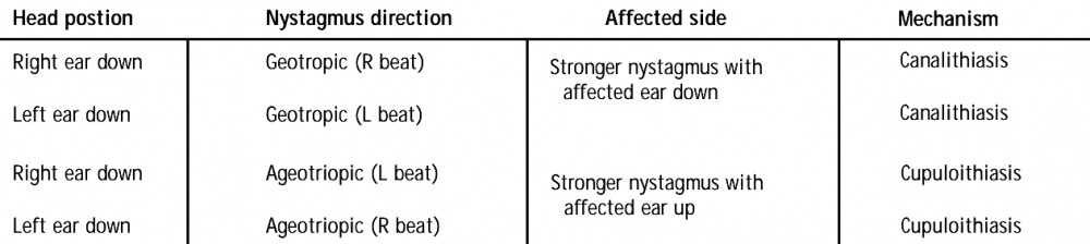Both types are characterised by so-called direction-changing positional nystagmus: that is, the direction of the positional nystagmus changes with changes in the head position.