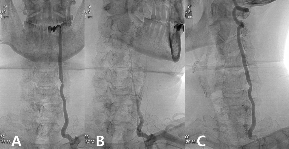 (A) Dynamic angiography shows narrowing of the left vertebral artery at the C5-6 level.
