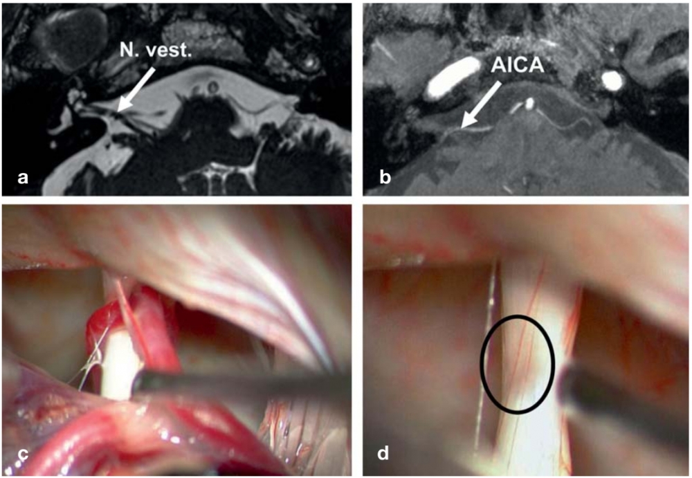 In over 95% of cases high-resolution MRI of the brainstem, specifically a CISS (Constructive Interference in Steady State) sequence, demonstrates vessel–nerve contact at the exit point of the eighth cranial nerve from the brainstem3. Of importance however, is that close contact between AICA and the 8th cranial nerve is seen in up to 40% of normal subjects4.