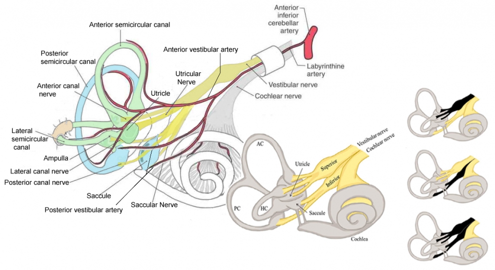 The superior branch of the vestibular nerve supplies the lateral/horizontal and anterior semicircular canals, and the utricle.