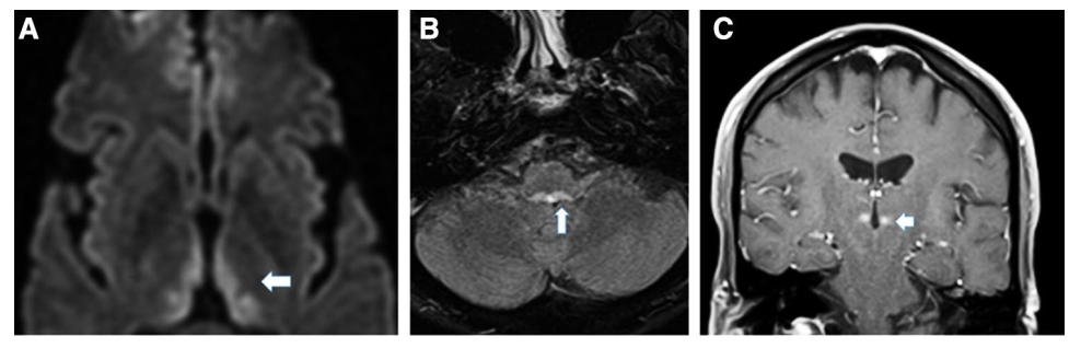 B: Arrow points to the medial vestibular and prepostus hypoglossi nuclei (FLAIR);