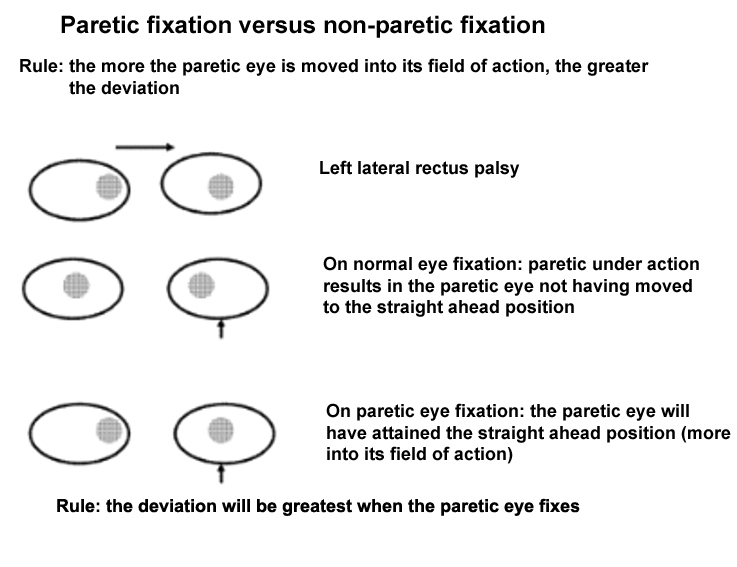 However, if the normal eye is fixing, the eye with the paretic muscle will be deviated because of a paretic underaction.