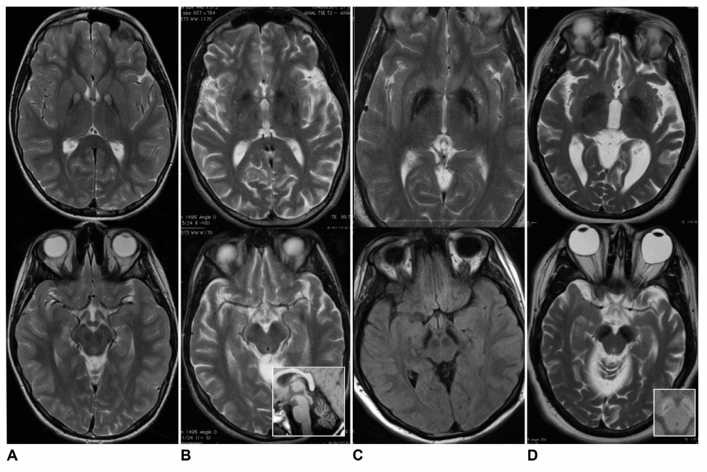 (B) Phospholipase A2-associated neurodegeneration (inset shows cerebellar atrophy);