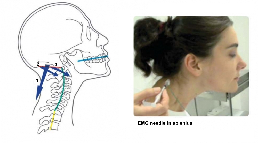 Figure shows goose neck posture with 1 indicating splenius capitis bilaterally, and 2 & 3 the sub-occipital muscles.