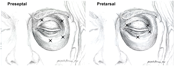 Commonly a combination of the pretarsal and preseptal injections is useful; pretarsal injections may have a longer duration of benefit and fewer side effects, such as ptosis. However, preseptal and/or orbital injections can be included if those areas appear especially active.