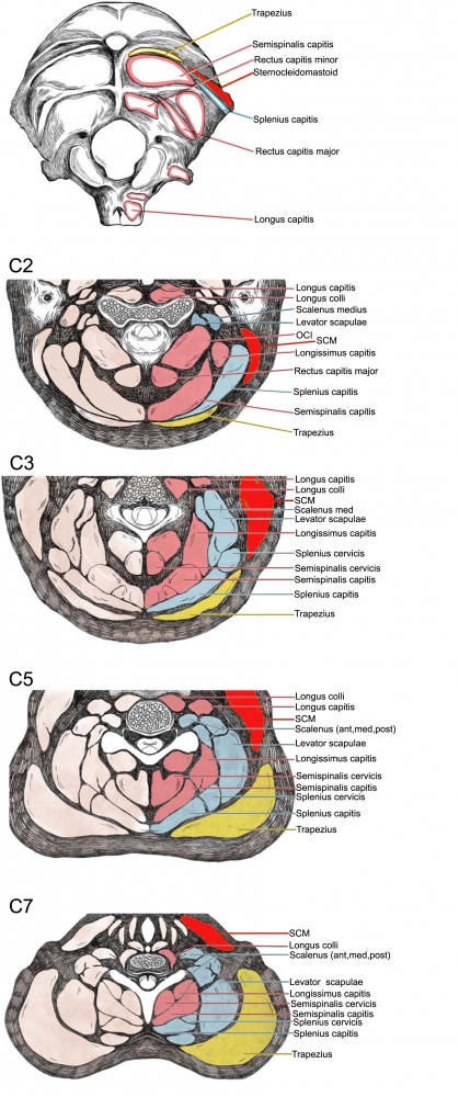 Relations: directly deep to the trapezius in the neck are the semispinalis capitis, the splenius capitis, and the levator scapulae.