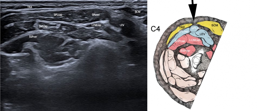 Figure 2. Ultrasound at level of C4. Approach indicated by black arrow.