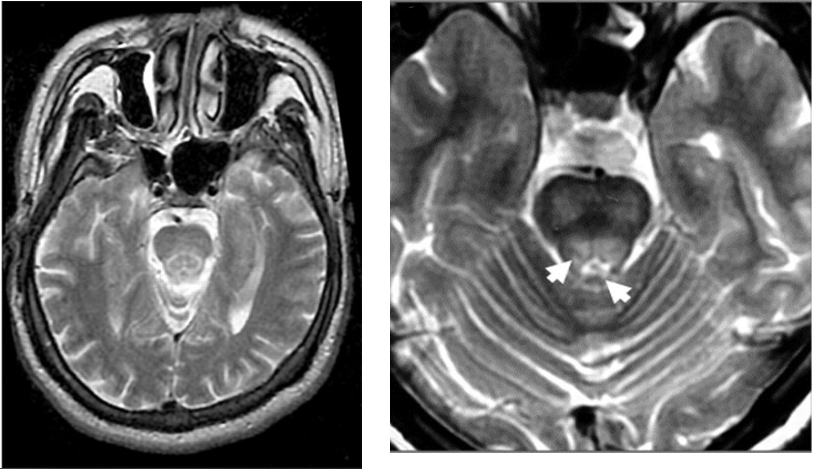 Typical MRI changes include symmetrical hyperintense or mixed intensity T2- weighted and FLAIR signal change in the striatum, especially the putamen, and also the thalamus, midbrain and pons.