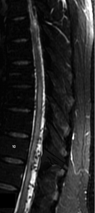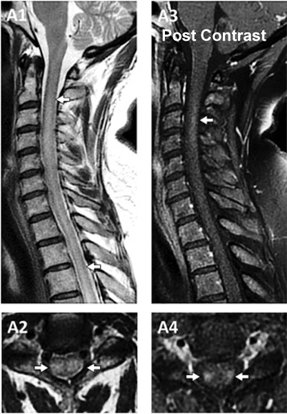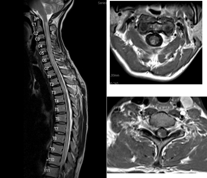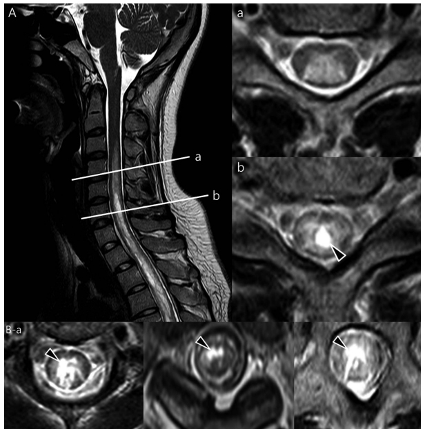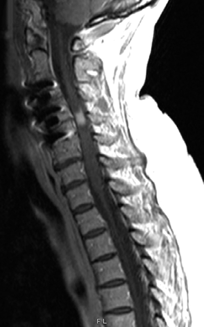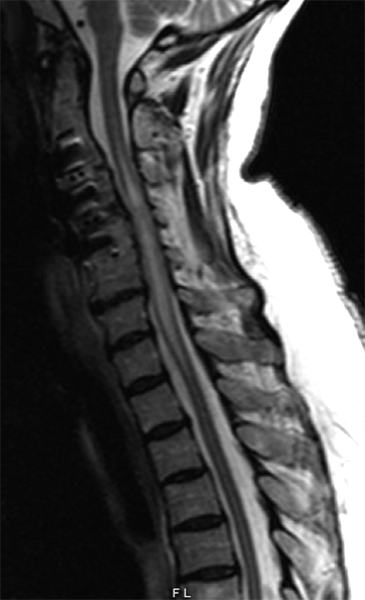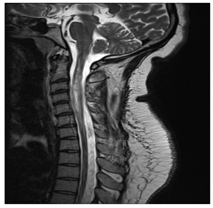 Q7: A 75-year-old woman with history of prior cervical spine decompression presented with progressive neck pain, asymmetric hand tingling, and neuropathic pain, followed by urinary incontinence and gait difficulty. Sagittal T2 weighted imaging likely shows?.