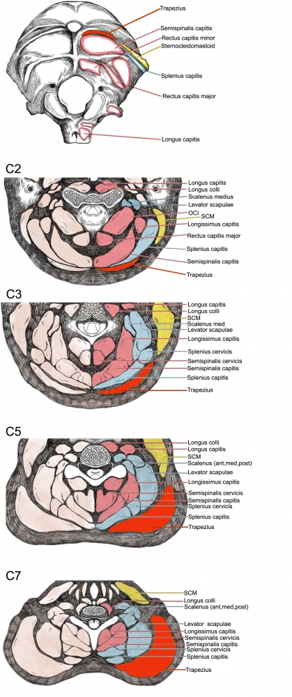 Relations: directly deep to the trapezius in the neck are the semispinalis capitis, the splenius capitis, and the levator scapulae.