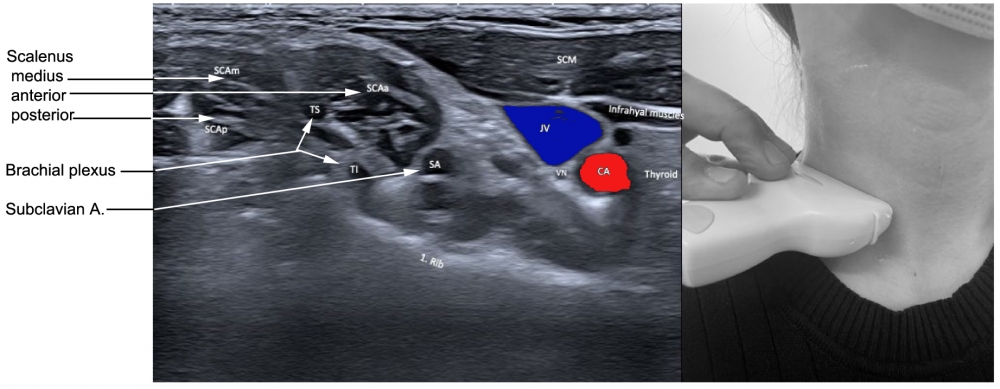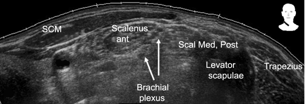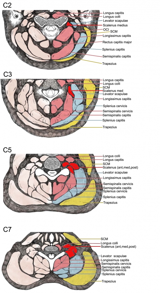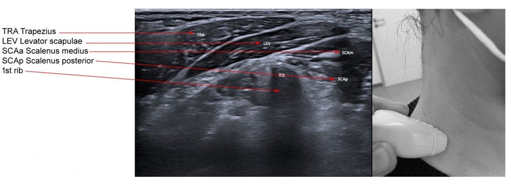 Scalenus medius is the largest muscle of the scalenus group, and arises from the transverse processes of the cervical vertebrae and inserts into the superior portion of the first rib. This muscle can elevate the first rib or bend and rotate the neck. A needle can be placed into the scalenus medius muscle by palpating the belly of the muscle, in the floor of the posterior triangle, two finger breadths anterior to the anterior border of the trapezius muscle. At this point the muscle is just beneath the skin. The upper portion can be inserted by placing the needle just anterior to the lateral edge of the splenius capitis muscle to a depth of 1.5 to 3.0 cm.