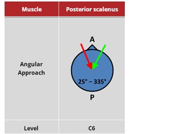 The scalene muscles are identified between the sternocleidomastoid and the levator scapulae. With insertion of the EMG needle into the scalenus muscle, the patient is asked to breathe in as deeply as possible. Since the scalenus is an auxiliary respiratory muscle, EMG activity should be clearly heard on the EMG. Generally either the scalenus posterior or the scalenus medius are treated. Both muscles have the same function: to elevate the rib to which they attach, and to bend and rotate the neck.
