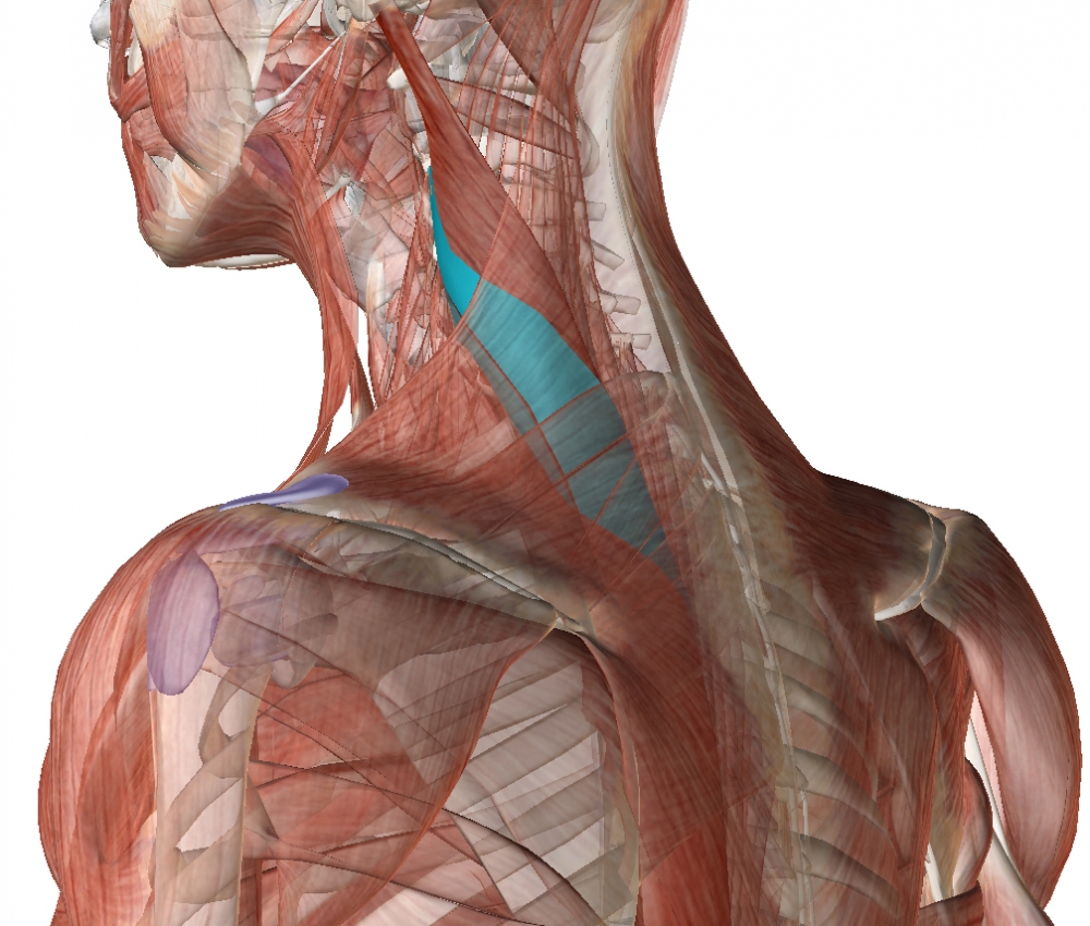 This muscle is deep to the levator scapulae muscle's attachment to the transverse processes, and its depth greatly varies from patient to patient, being often unexpectedly superficia in some adults.