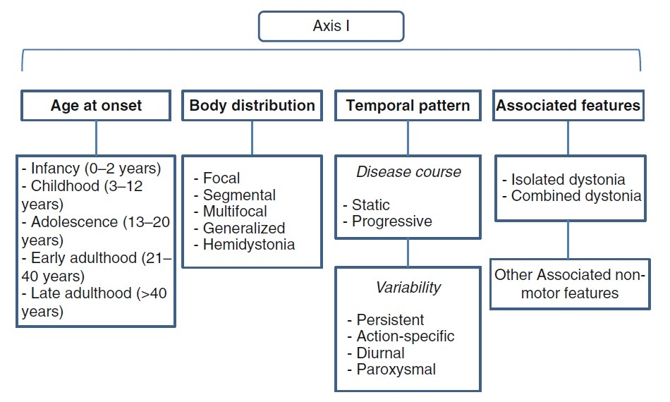The aim of the system is that, once a patient is classified phenomenologically according to the first axis (see figure below), a dystonia syndrome may then be defined, which is diagnostically useful3.